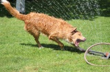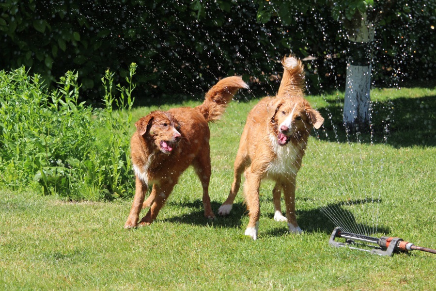 Abby und Feli haben Spaß mit dem Rasensprenger. Da macht es einfach Spaß zuzusehen, wie die Beiden mit dem Wasser kämpfen. Und während die Beiden das machen, schaut Halona lieber aus dem Schatten zu.