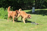 Es ist schon unglaublich, wie schnell alles so abläuft. Die ersten vier Wochen sind schon vorbei und die Kleinen haben den halben Garten erobert. Es wird nur noch ein zwei Tage dauern, dann ist der Garten kein Problem mehr. Schon jetzt laufen sie bis in die Mitte, wenn sie gerufen werden. Alles Neue wird erkundschaftet und Angst kennt keiner der Zwerge. Schön ist immer, dass die Welpen mit den Großen spielen und Halona es gut findet. So muss sie nicht immer alles machen. Genug Abwechslung ist gegeben, da am Wochenende schon Besuch da war. Ich kann ja nur meine Sicht beschreiben, aber ich denke, alle inkl. Welpen hatten Spaß.