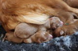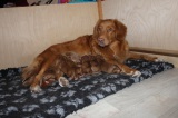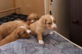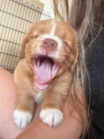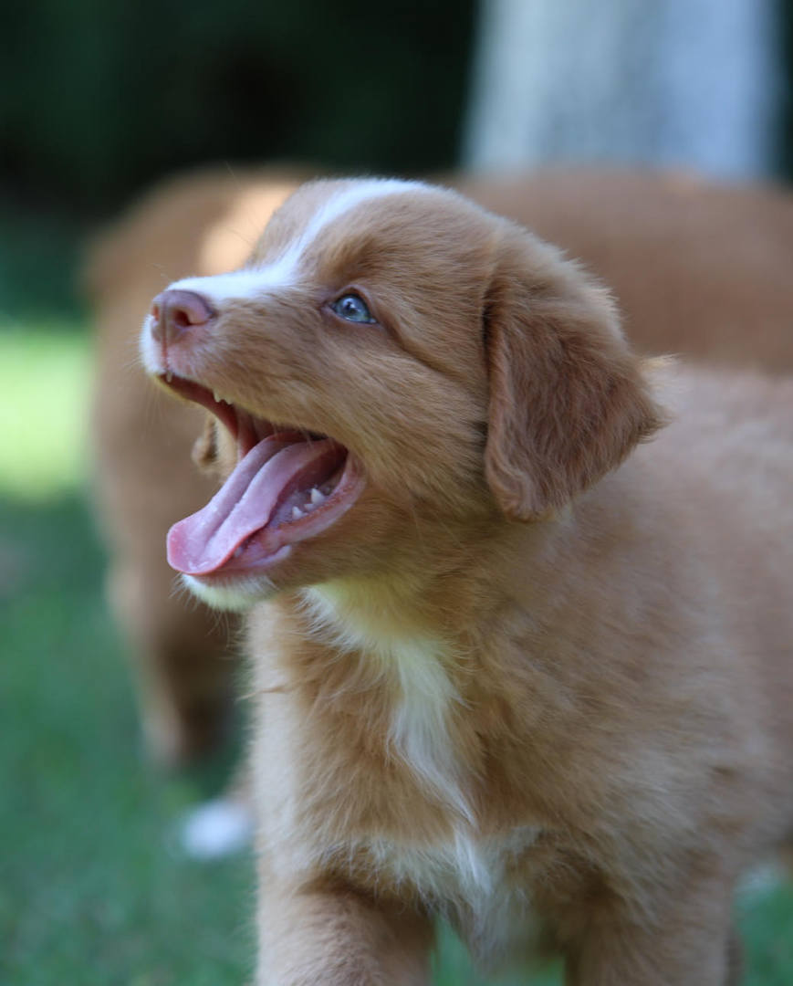 Auf der linken Seite schläft die kleine Maus einfach mal so auf meinem Fuß ein. Nach gefühlten 20 Minuten musste ich dann aber aufstehen, weil mir dieser einfach mal eingeschlafen ist. Das Bild auf der rechten Seite zeigt wohl eine ebenfalls sehr müde Tollerdame, aber es könnte auch als zufriedenes Lachen interpretiert werden. Es war auf jeden Fall keinen Schreien was hier vielleicht auch hiinterstecken könnte. Der Wurf ist alles in allem sehr gelungen. Die Welpen entwickeln sich hervorragend und zeigen keine Scheu bei neuen Besuchern.