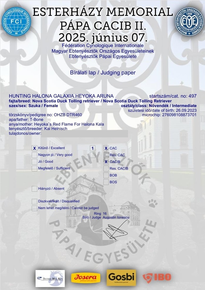 Was für außerordentlich gute Nachrichten. Die kleine Aruna aus dem G-Wurf war am heutigen Tag auf einer Show in Ungarn erfolgreich. Sie wurde mit einem Vorzüglich ausgezeichnet und zusätzlich noch mit den Auszeichnungen C.A.C. und C.A.C.I.B ausgezeichnet. Damit hat sie die Bescheinigung erhalten, dass sie die Befähigung zum nationalen Championat erhalten hat. Was aber noch unglaublicher ist die Anwartschaft auch für den Titel des internationalen Schönheitschampion erweitert ist. WOW.